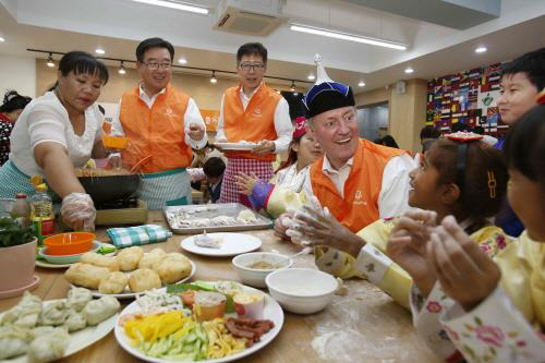 | ◇한화케미칼 방한홍 대표(좌측 첫 번째 주황색 조끼), 한화케미칼 바이오사업부 폴 콜만 대표(우측 첫 번째 주황색 조끼) 및 임직원들이 서울 구로구에 위치한 사회복지단체 '지구촌 사랑나눔'을 찾아 다문화가정 어린이들과 세계 각국의 명절음식을 만들며 즐거운 시간을 보내고 있다.. |