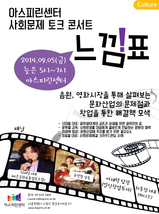 아스피린센터 관계자는 "사회문제 해결 토크콘서트는 문화를 테마로 해서 대표적인 문화산업인 음원과 영화산업의 현재와 문제점을 진단하고 그 해결방안을 모색하기 위한 방법으로서의 창업에 대해 생각하는 계기가 될 것"이라며 "문화산업에 관심있는 분들과 문화산업 분야의 창업을 준비하는 분들의 적극적인 관심과 참여를 바란다"고 말했다.