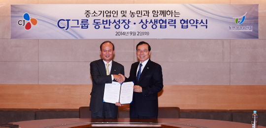 CJ그룹 이채욱 부회장은 2일 중구 필동 CJ인재원에서 동반성장위원회와 손잡고 우수 '중소 챔피언 기업'을 발굴·육성하고 농업의 미래성장산업화를 지원하는데 합의하는 동반성장·상생협력 협약식을 체결했다.
