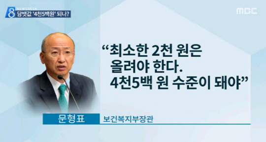 문형표 보건복지부 장관은 2일 정부세종청사 보건복지부 기자실을 방문한 자리에서 "2004년 담배가격이 500원 오른 후 판매량이 감소하고 흡연율도 15%p 정도 떨어졌지만 2008년 이후에는 흡연율 하락 추세가 정체에 빠졌다"며 "흡연율을 낮추려면 가격정책이 최선이기 때문에 담뱃값을 4천500원 정도로 올려야한다"고 말했다.