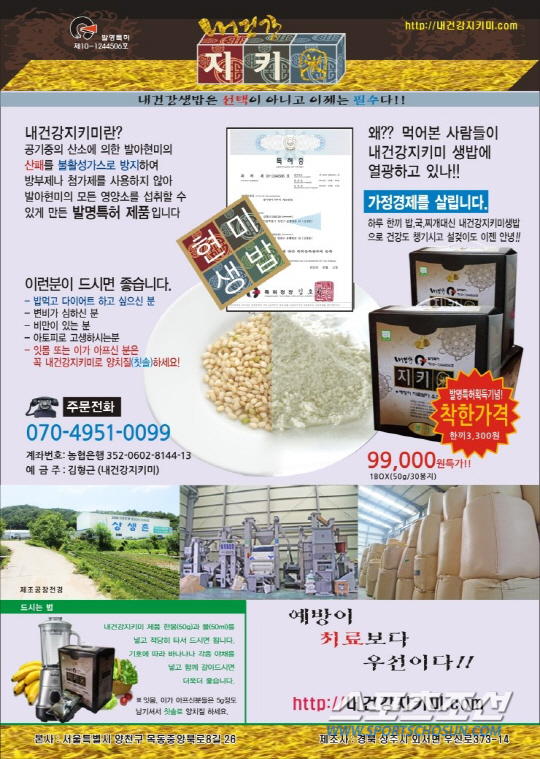 이에 김 대표는 현미의 영양성분을 그대로 섭취할 수 있는 방법들을 고안하기 시작했고 꾸준한 임상실험을 통해 그 결과물인 '현미생밥'을 출시하는데 이르렀다. 왕겨를 벗겨낸 현미에 적정한 수분·온도·산소를 공급해 1mm~5mm 정도 싹을 틔운 발아현미로 만든 '현미생밥'은 공기 중의 산소에 의한 발아현미의 산패를 불활성가스로 방지해 발아현미의 모든 영양성분을 섭취할 수 있도록 한 발명특허 제품이다. 또한 물 50ml에 제품 한 봉(50g)을 넣어 타먹는 방식이기 때문에 열로 인한 발아현미의 영양성분이 파괴되는 것을 걱정하지 않아도 된다.