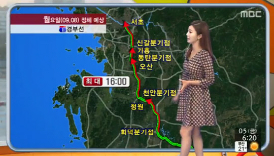 추석 연휴를 하루 앞둔 5일 오후부터 귀성객들이 몰려 정체가 본격화될 전망이다. 한국도로공사 고속도로 교통상황에 따르면, 5일 오후 1시 30분 기준 서울-부산 5시간, 서울-울산 5시간 10분, 서울-대구 4시간 10분, 서울-목포 4시간 30분, 서울-광주 4시간, 서울-대전 2시간 30분 등으로 예상한다.