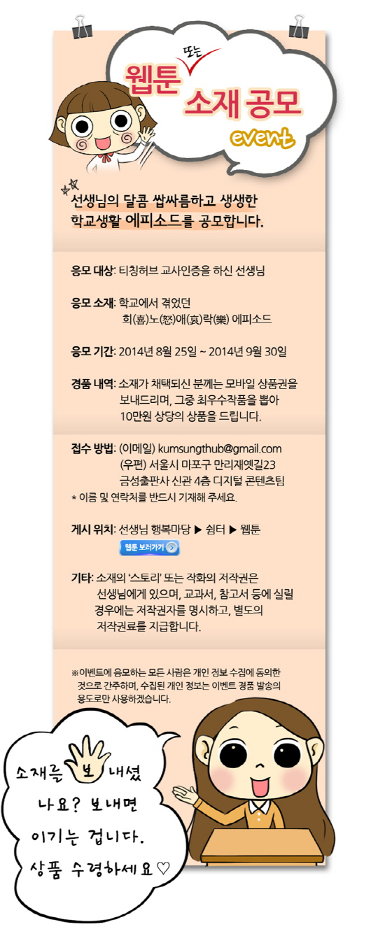 금성출판사는 교사 웹툰에 보다 사실적이고 다양한 이야기들을 담아내기 위해 교사들이 학교에서 겪었던 희(喜), 노(怒), 애(哀), 락(樂)의 에피소드를 공모한다.