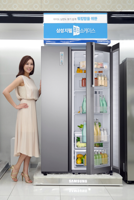 삼성 '지펠 푸드쇼케이스'는 냉장실 안쪽을 열고 닫는 인케이스 문과 바깥쪽을 여닫는 쇼케이스 문을 따로 만들어 인케이스는 부피가 크고 오래 보관해야 하는 식재료를 신선하게, 쇼케이스에는 자주 먹는 음식을 간편하게 보관할 수 있다.