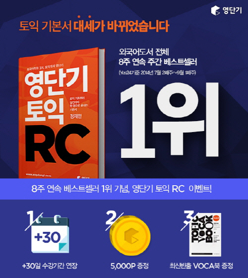 영단기(www.engdangi.com)는 영단기의 첫 번째 토익 기본서 <영단기 토익RC>가 외국어 주간베스트셀러에서 8주 연속 1위 달성(예스24기준, 7월 2째 주~9월 1째 주)이라는 기록적 행보를 이어가고 있는 것을 기념해 다양한 혜택을 담은 이벤트를 진행한다.