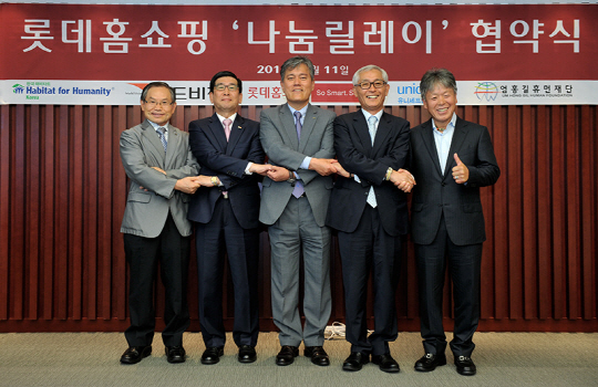 롯데홈쇼핑이 11일 서울 양평동 본사에서 사회공헌 활동 강화와 임직원의 나눔 활동 참여 확대를 위해 비영리 구호단체들과 '나눔 릴레이' 협약식을 가졌다.