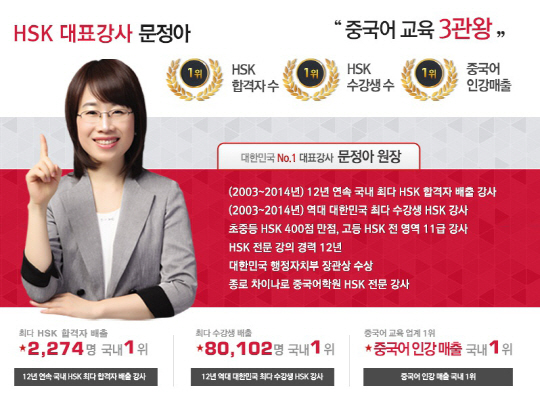 한편 문정아중국어는 2003년 설립된 국내 최대 온라인 중국어학원이다. 현재까지 업계에서 유일하게 HSK 합격자 수 1위, HSK 수강생 수 1위, 중국어 인강(인터넷 강의) 1위라는 3관왕 타이틀을 보유하고 있다. 또 '올패스' 라는 전 강좌 자유이용권 서비스를 제공, 기간별로 최대 93%까지 할인된 가격에 무제한으로 강의를 들을 수 있는 가격 정책을 운영하고 있다. 최근 '1:1 맞춤별 학습시스템' 서비스를 론칭, 인강으로 수강하고 전화중국어로 한번 더 복습할 수 있도록 해 개인별 맞춤 학습을 가능케 했다.