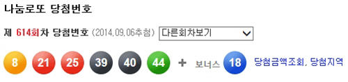 지난 6일 나눔로또 추첨결과 로또 614회 당첨번호는 '8, 21, 25, 39, 40, 44'였고 2등 보너스 번호는 '18'로 나타났다.