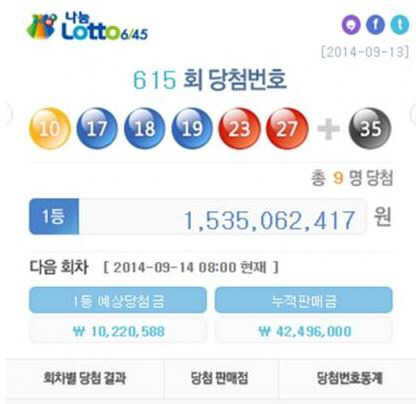 14일 나눔로또 홈페이지에 따르면 615회 1등 당첨번호는 '10, 17, 18, 19, 23, 27'이며, 보너스 번호는 '35'이다.