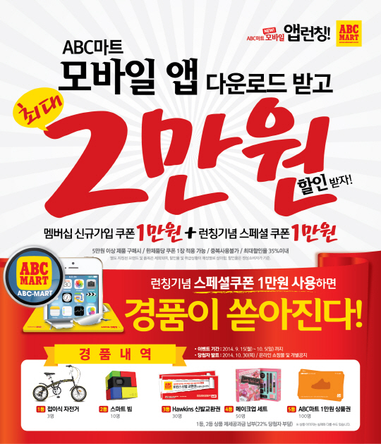 신규 모바일 앱 론칭 기념 이벤트는 10월 5일까지 진행되며, 행사 기간 동안 ABC마트 모바일 앱을 다운 받는 모든 고객들에게 1만원 론칭 기념 스페셜 쿠폰을 증정한다. 해당 쿠폰은 회원 가입 후 쿠폰페이지에서 다운받을 수 있으며, 다운 받은 날로부터 2주 동안 온오프라인 및 모바일에서 특가 상품을 제외하고 5만원 이상 제품 구매 시 사용 가능하다. 멤버십 신규 가입 고객은 1만원 할인 쿠폰도 함께 제공 받을 수 있어 최대 2만원까지 할인 혜택을 누릴 수 있다.(중복 사용 불가, 한 제품당 쿠폰 1장 적용 가능, 최대할인율 35%이내 사용 가능)
