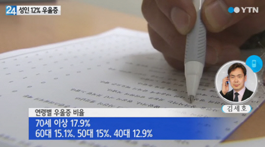 14일 질병관리본부가 '세계 자살 예방의 날(10일)'을 맞아 발표한 '한국 성인의 우울증상 경험' 보고서에 따르면 2012년 국민건강영양조사(전국 3천840가구 대상) 결과, 19세이상 성인의 12.9%가 "최근 1년 안에 우울증을 경험했다"고 답했다.