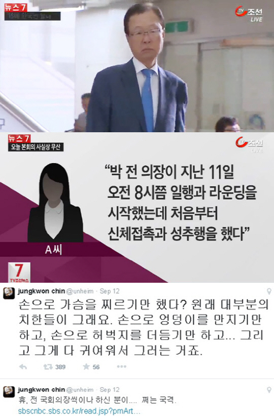 이어 진 교수는 "손으로 가슴을 찌르기만 했다? 원래 대부분의 치한들이 그래요. 손으로 엉덩이를 만지기만 하고, 손으로 허벅지를 더듬기만 하고…그리고 다 귀여워서 그러는 거죠"라며 박 전 의장의 해명을 비꼬았다.