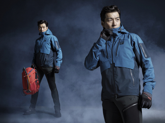 하이브리드 재킷 등 최상의 기능성을 갖춘 '마운티니어링 라인'을 착용했을 때는 가장 강렬하고 남성적인 카리스마를 분출했으며, 가족과 함께 캠핑이나 트레킹을 편안하게 즐길 수 있는 '트레킹 라인'을 착용했을 때는 따뜻하고 댄디한 느낌이 물씬 풍기는 섬세한 표정으로 두 가지 라인을 전혀 다른 감성으로 표현했다.