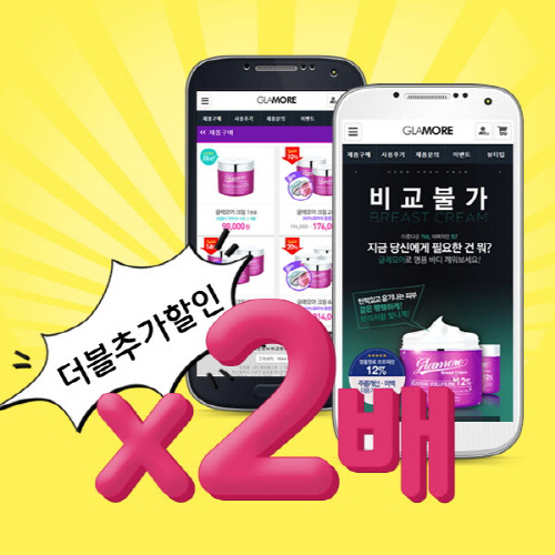 글래모어에 따르면 이번 모바일 더블할인은 글래모어 회원이라면 누구나 모바일 페이지에서 즉시 사용이 가능한 할인쿠폰 발급 등 파격적인 사은행사로 많은 고객들의 관심을 끌고 있다.