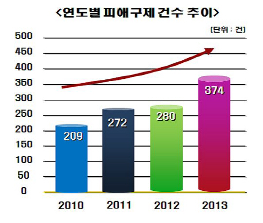 연도별로 살펴보면 2010년 209건, 2011년 272건, 2012년 280건, 2013년 374건 등 해마다 증가세를 보였다.
