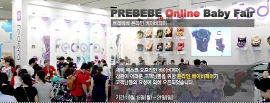 유아용품전문업체 (주)쁘레베베(www.prebebe.co.kr, 대표 정세훈)가 세텍 2014베이비엑스포 강남, 벡스코 2014부산베이비&키즈페어 참가를 앞두고 쁘레베베샵(www.Prebebeshop.co.kr)에서 온라인 베이비페어를 진행한다.