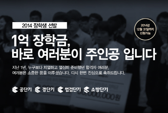 공무원시험전문 '공단기(www.gongdangi.com)'가 2014년 공무원시험 최종 합격자를 대상으로 '제3회 공단기 1억 장학생'을 모집한다.