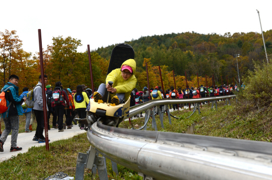 추석이 지나자 슬로프 주변에는 벌써 가을 잔치가 시작됐다. 알록달록 코스모스, 쑥부쟁이와 은빛 억새, 푸른 하늘에 걸린 조각구름이 가을빛 수채화를 담아낸다. 슬로프길 위로는 쉼 없이 곤돌라가 청명한 하늘 길을 오간다. 초반 트레킹코스에서는 가파른 경사로를 질주하는 짜릿한 알파인코스터도 만난다.