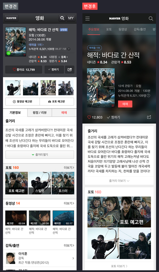 네이버 관계자는 "모바일에서 영화 컨텐츠를 이용하는 이용자들이 많아짐에 따라 다양한 정보들을 압축적으로 제공할 수 있는 방향으로 개편했다" 며 "사용자 반응을 고려해 모바일 이용성을 강화해나갈 것" 이라고 말했다.