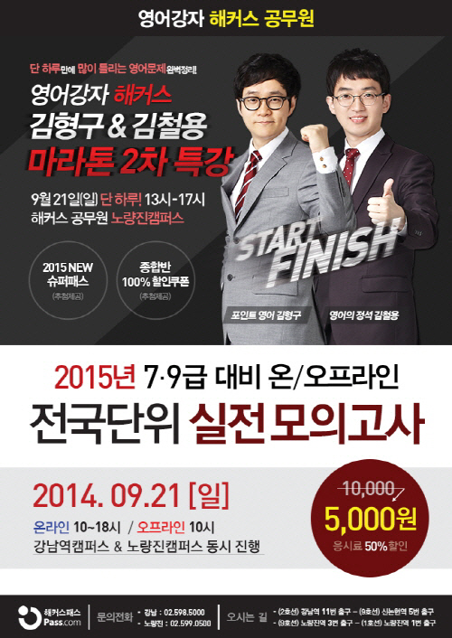 최단기합격 1위 공무원 시험 전문학원 해커스패스 공무원(www.PASS.com) 이 수험생들이 가장 많이 틀리는 영어 문제를 선별하여 오는 21일 해커스패스 공무원 노량진 캠퍼스에서 마라톤 2차 특강을 진행한다. (헤럴드미디어 [2014 대학생 선호 브랜드대상] '가장 빠르게 합격할 수 있는 공무원학원' 분야 1위)