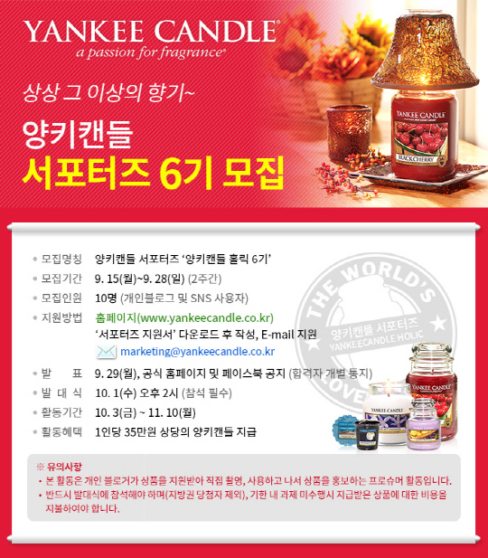'양키캔들 서포터즈'는 향초, 디퓨저, 홈데코 등 생활 방향 제품에 관심이 많은 블로거를 대상으로 선발한다. 페이스북, 블로그 등 소셜 네트워크에서 적극적으로 활동한 경력이 있는 참가자를 우대한다. 서포터즈로 선발되면 내달 1일 발대식을 시작으로 11월 10일까지 약 1개월 간의 공식 활동을 한다. 서포터즈에게는 미션별 베스트 상품 등을 제공받으며 향초 정보, 매장 홍보 등 다양한 온라인 홍보 활동과 신제품을 가장 빨리 사용해 볼 수 있는 기회가 주어진다.
