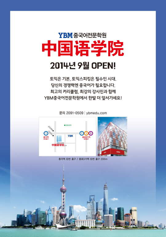 한편, 지난 9월 서울 종로3가에 확장 오픈한 YBM중국어전문학원은 5층 규모로 종로, 강남, 신촌에서 운영되던 중국어전문학원의 커리큘럼을 통합·강화했다. 또한 전문 강사 인프라를 확충해 본격 중국어 학습시대를 연다는 계획이다. 앞으로 HSK, TSC와 같은 중국어 인증시험 대비반뿐 아니라 직장인을 위한 비즈니스 중국어 강좌 및 1:1 회화, 토요 집중반 등 다양한 중국어 특화 강좌를 제공할 예정이다. 이벤트에 대한 상세한 정보는 YBM중국어전문학원 홈페이지(ybmedu.com)에서 확인할 수 있다.