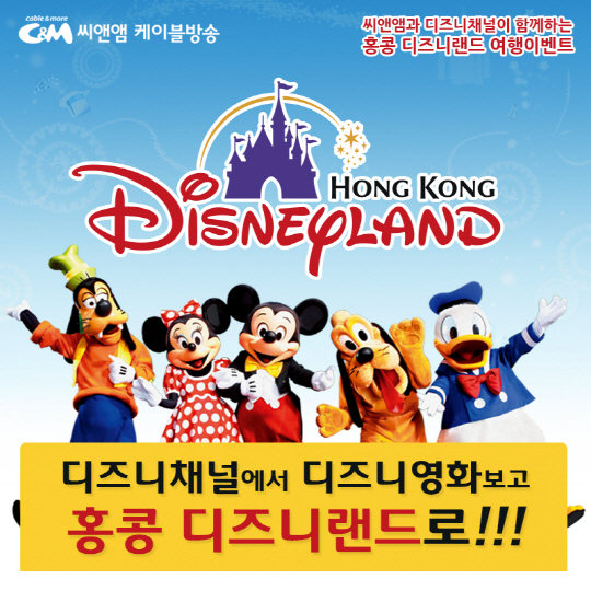 씨앤앰 케이블방송(대표 장영보)과 디즈니채널이 10월 2일까지 시청자들을 대상으로 홍콩 디즈니랜드 여행 상품권 및 디즈니 장난감, 문구세트 등 푸짐한 경품을 제공하는 이벤트를 벌인다.