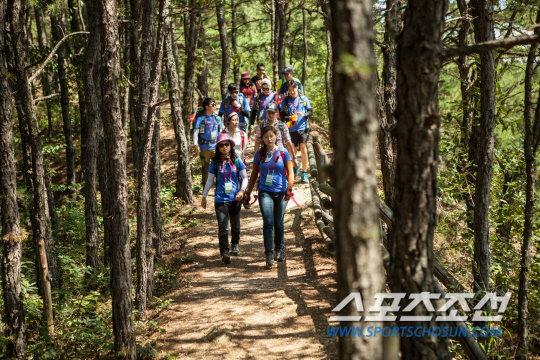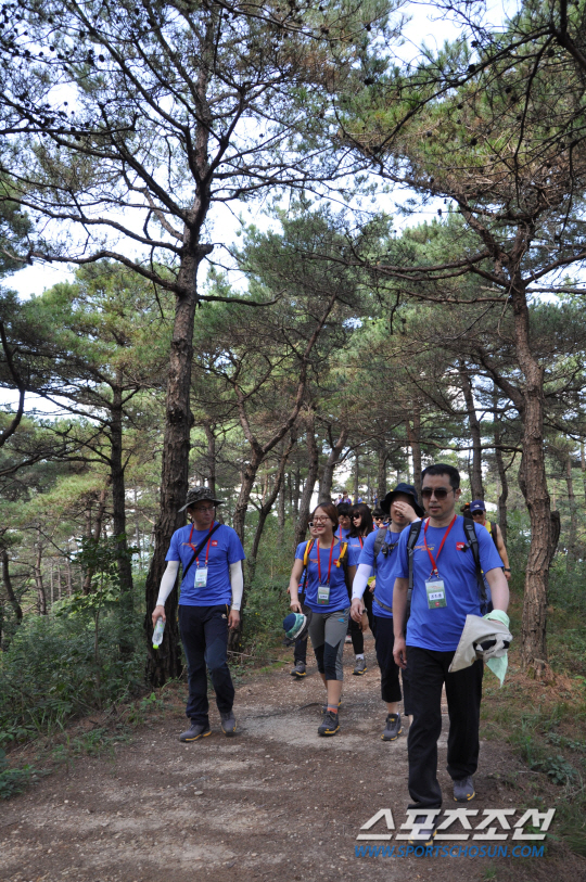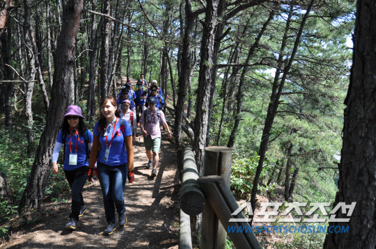 봉수대를 거쳐 두번째 전망대인 용포대까지의 길도 말 그대로 완만한 트레킹 길이다. 남녀노소 누구나 와서 쉽고 편안하게 힐링을 할 수 있는 곳이다. 두번째 전망대인 용포대는 사방이 더 거칠 것이 없다. 이번 하이킹에 동참한 홍승기 대원(한국외대)은 지난 4월 히말라야의 미답봉인 루굴라봉(6899m)를 올라갔다 온 정통 산악인. 높이로는 비교가 안되지만 그 깊이에 감흥한 듯 연신 싱글벙글이다.