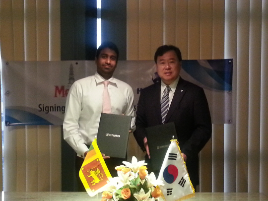 하이트진로는 16일 스리랑카 멘디스社에서 소주 원액 수출 및 현지 생산 협약식을 체결했다. 왼쪽은 아준 아로이시우스(Arjun Aloysius) 멘디스社 회장, 오른쪽은