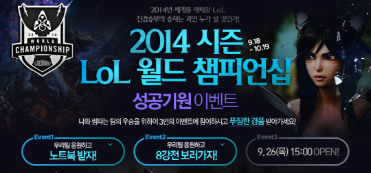 인터파크(www.interpark.com)가 전세계 유저들의 관심을 사로잡고 있는 글로벌 e스포츠 '2014시즌 LoL 월드 챔피언십'의 성공 기원 이벤트를 진행한다.