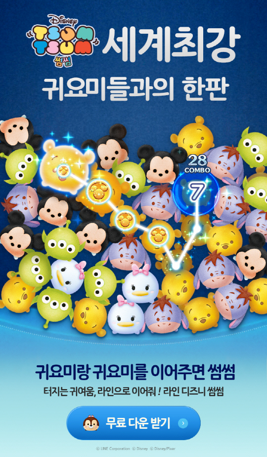 글로벌 모바일 메신저 라인(LINE)이 18일 귀여운 디즈니 캐릭터를 활용해 전세계 이용자들의 큰 호응을 얻고 있는 캐주얼 게임 '라인 디즈니 썸썸(Tsum Tsum, https://game.line.me/lp/ex/tsumtsumkr/)'의 국내 서비스를 시작한다고 밝혔다.