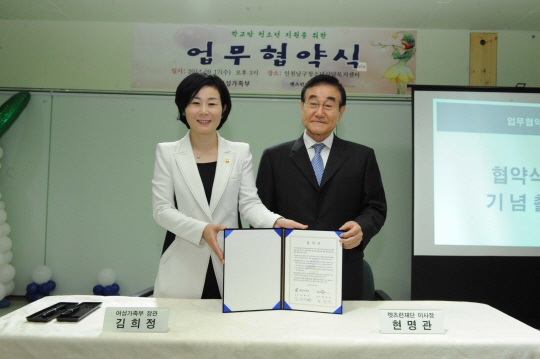 ◇김희정 여성가족부장관(왼쪽)과 한국마사회 현명관 회장이 청소년 지원을 위한 MOU를 체결했다. 나성률 기자 nasy@sportschosun.com