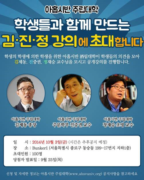 이번 공개강의는 '아홉시반 주립대학'의 2학기 개강과 함께 재학생들의 뜨거운 요청에 의해 결정된 것으로, '아홉시반 주립대학' 총장 김제동과 본교 酒문학부 주임교수 진중권 그리고 정재승 뇌공학 교수가 초빙돼 참여할 예정이다.