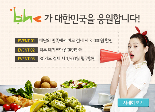 깨끗한 치킨 bhc가 대한민국 국가대표 선수들의 응원과 선전을 기원하기 위해 다양한 할인 이벤트를 펼친다.