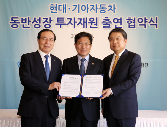 현대·기아차는 18일 플라자 호텔(서울 중구 소공로 소재)에서 산업통상자원부 윤상직 장관, 동반성장위원회 안충영 위원장, 현대차그룹 정진행 사장 등 관계자들이 참석한 가운데 동반성장 투자재원 500억원 출연 협약식을 가졌다. 왼쪽부터 동반성장위원회 안충영 위원장, 산업통상자원부 윤상직 장관, 현대차그룹 정진행 사장.