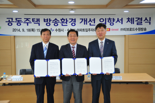 티브로드(대표 이상윤)가 수원시와 수원시아파트입주자대표협회와 함께 방송환경 개선을 위한 의향서 체결식을 가졌다.