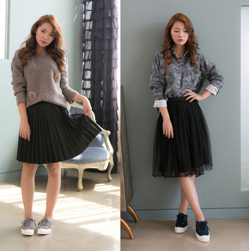풍성한 니트에 주름가죽스커트,박시한 카모플라쥬 셔츠에 쉬폰 원피스에 지젤더보니의 로우탑 스니커즈를 착화해보자