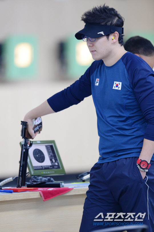 진종오가 21일 인천 옥련국제사격장에서 열린 2014 인천아시안게임 사격 남자 10m공기권총 본선에 출전해 숨을 고르고 있다.