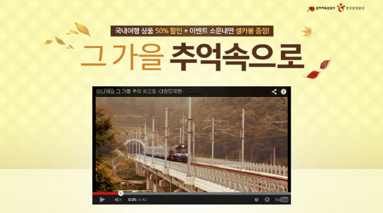 먼저 오는 9월 28일까지 '그 가을 추억 속으로' 프로모션을 통해 전국 유명 여행지 여행 상품을 최대 50% 할인 판매한다. 상품별로 선착순 4명까지 해당된다. '강원도 2박3일 양떼목장+설악산+레일바이크'(12만4500원), '제주도 2박3일 올레 15코스+섭지코지'(15만5000원) 등이 대표 상품이다.
