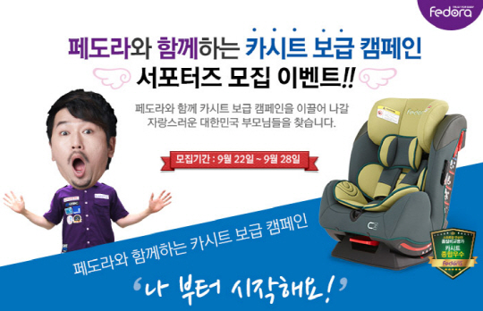 유아용품전문업체 ㈜쁘레베베(www.prebebe.co.kr, 대표 정세훈)의 글로벌유아용품브랜드 페도라(Fedora)가 10월 카시트 보급 캠페인을 앞두고 서포터즈 모집 및 카시트 할인 이벤트를 진행한다.