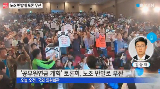 한국연금학회는 이날 오전 10시 국회 의원회관에서 새누리당 의원들이 참석한 가운데 '공무원연금 개혁을 위한 정책토론회'를 열 예정이었지만, 공무원노조 지도부와 노조원 200여 명이 토론회장에 대거 참석해 "연금개혁 해체', "새누리당 해체' 등의 구호를 외치며 소란을 피워 결국 오전 10시27분 토론회 취소를 선언했다.