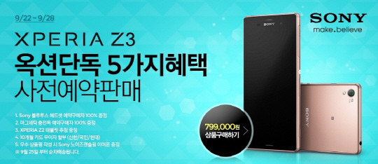 국내 대표적인 온라인 마켓플레이스 옥션(www.auction.co.kr)이 오는 24일까지 소니코리아의 '엑스페리아Z3' 를 오픈마켓 단독으로 예약 판매한다.