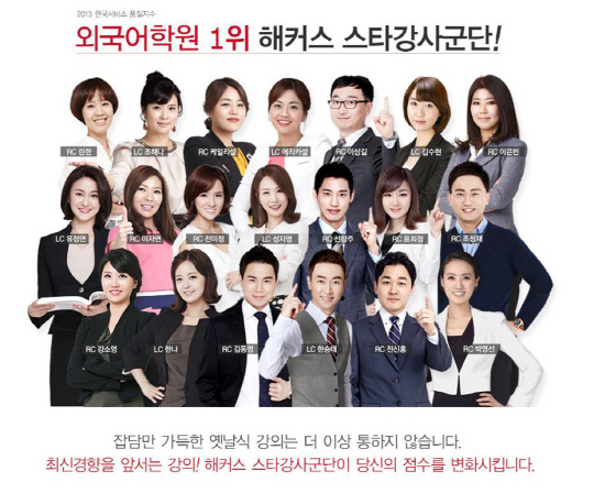 해커스 어학원은 2013 한국서비스 품질지수가 선정한 외국어학원 1위로, 베스트셀러 교재, 스타강사군단, 철저한 스터디로 단기간에 원하는 토익점수를 만들어주기로 유명하다. 특히 해커스 스타강사진의 철저한 준비와 연구로 오직 학생들의 공부만 생각하는 열정이 해커스 어학원을 외국어학원 1위로 만든 일등공신으로 꼽히고 있다. 송진현 기자 jhsong@sportschosun.com