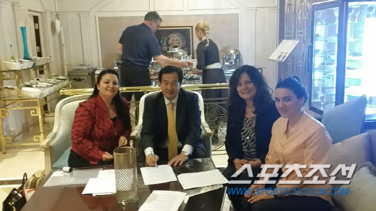 한빛코리아 김수남 대표(왼쪽 2번째)가 터키 필 코즈메틱사를 방문해 총판계약서에 사인하고 있다. 사진제공=한빛코리아