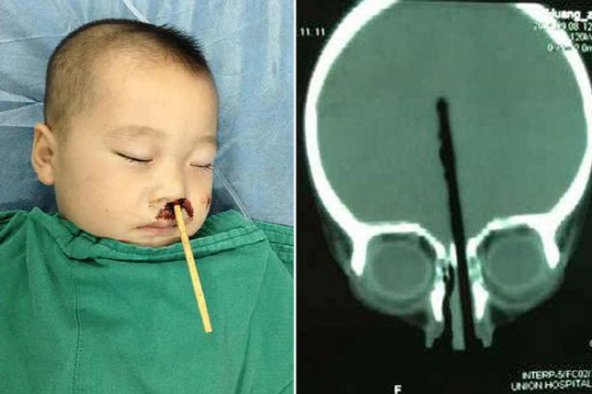 의료진이 아이의 상태를 확인하기 위해 MRI 촬영을 해보니 젓가락이 코를 관통, 3인치 가량 뇌에 박힌 것을 확인했다. 4시간의 수술끝에 젓가락을 제거한 담당의사는 "아이의 신경이나 조직이 다치지 않은 것은 기적적이다"고 밝혔다.