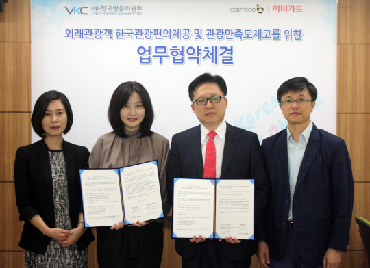 | 이비카드가 한국방문위원회 본사에서 업무협약 체결식을 가졌다. 왼쪽부터 한국방문위원회 이은정 팀장, 한경아 사무국장, 이비카드 차재원 마케팅부문장, 하성민 마케팅팀장. 사진제공=이비카드 |