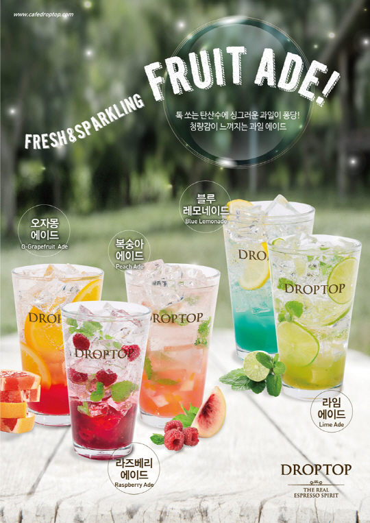 프랜차이즈 커피전문점 드롭탑이 초정리 천연 탄산수를 이용한 과일 에이드 4종을 출시했다.