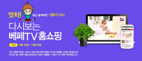 국내 최대 규모 베이비페어 주최사 ㈜베페(www.befe.co.kr)가 30일(화)까지 베페TV 홈쇼핑(mall.befe.co.kr)을 통해 전시회 특가로 판매하는 '다시보는 베페TV 홈쇼핑' 이벤트를 진행한다.