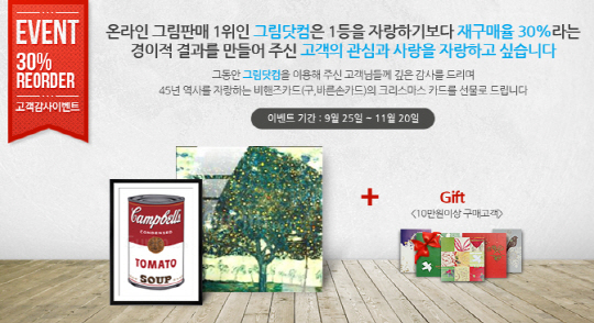 한편, 그림닷컴은 고객의 관심과 사랑에 감사하는 의미로 11월 20일까지 '재구매율 30% 고객감사 이벤트'를 진행한다. 이번 이벤트는 10만원 이상 구매한 모든 고객과 그림닷컴 이벤트 페이지(www.gurim.com/event/E20140925.aspx)를 통해 축하 댓글을 남긴 고객 중 30명을 추첨해 비핸즈카드의 크리스마스 카드 5장을 선물로 증정한다.