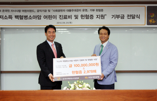 KB국민은행(www.kbstar.com)은 25일 여의도 세우회 본점에서 한국백혈병소아암협회 안민석 협회장이 참석한 가운데'저소득 백혈병소아암 어린이 진료비 및 헌혈증 지원'을 위한 기부금 1억원과 헌혈증 2,978 매를 한국백혈병소아암협회에 전달했다.